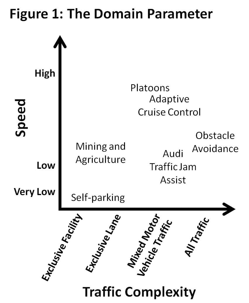 “Domain” identifies the environments for which a particular technology is intended. As Figure 1 shows, it encompasses two key variables: operating speed and traffic complexity (including automated motor vehicles only, a mixture of automated and conventional motor vehicles, and a mixture of pedestrians, bicyclists, and motor vehicles). It also indicates any particular road or weather conditions (such as construction, snow, and sunrise) for which the technology is not intended.