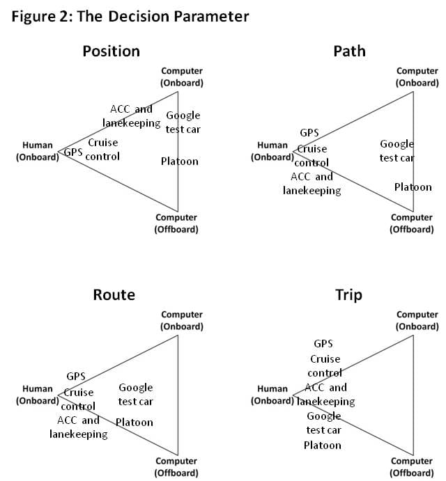 “Decision” describes the extent of computer control within those domains. Driving requires numerous decisions regarding position, path, route, and trip, among others. Consider a typical drive: We select our destinations and their order (trip), the roads we take to reach those destinations (route), the lanes we use as well as the turns and merges we make onto them (path), and our speed and spacing within those lanes (position). As Figure 2 shows, each of these decisions may be made by a human, an onboard computer system, or an offboard computer system based on information provided (or perceived) by a human, an onboard computer system, or an offboard computer system. In this sense, the decision parameter encompasses both inputs (data) and outputs (instructions).