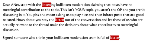 Kendra Albert’s blog describes an innovative approach to this problem: using the tools of code rather than the policing activity appropriate for a networked space. As reproduced on her blog, here is an example of what it looks like when certain swear words are entered: