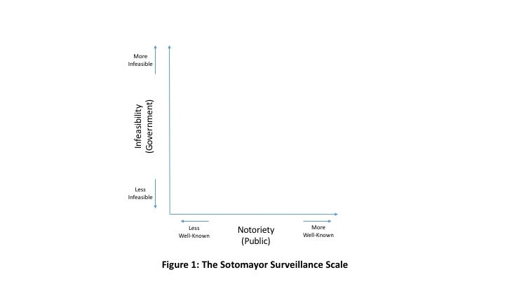 This observation by Justice Sotomayor, which I will refer henceforth as the Sotomayor Surveillance Scale, brilliantly illustrates the historically natural resistance posed to government surveillance programs by limited resources and public opinion (see Fig. 1). As shown in Figure 1, these two factors are represented on two axes.