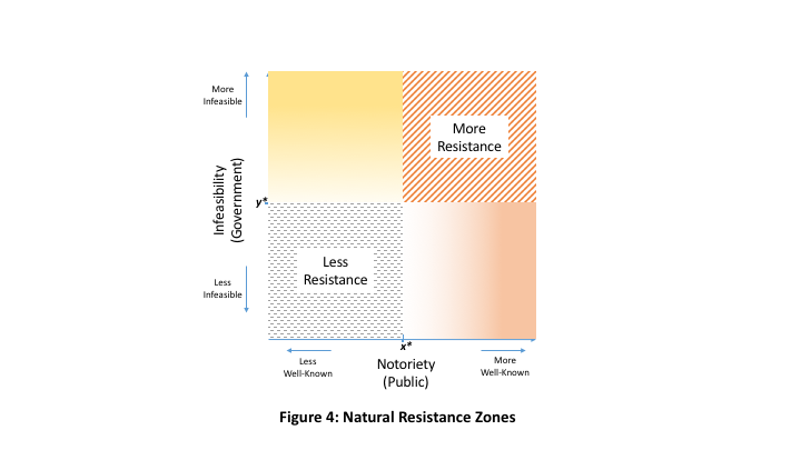 The x-axis, labeled "Notoriety," reflects how well-known or observable a surveillance program is, thus opening it up to public scrutiny and possible disapproval. The y-axis, labeled "Infeasibility," shows how practical (or impractical) a surveillance program is due to increased requirements, resulting in a natural resistance based on resource availability.