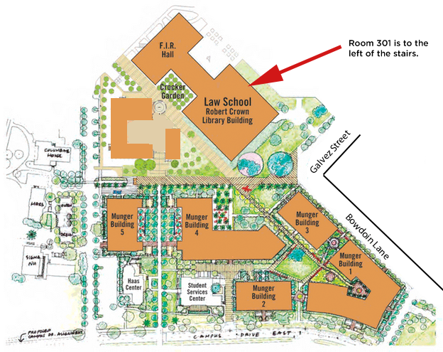 From Parking Structure 6 walk down Bowdoin Lane and you'll reach the Law School Building at the fork in the road.Room 301 is on the third floor of the Law School. Take elevator or stairs up to the third floor, room 301 is closest to the stairs.