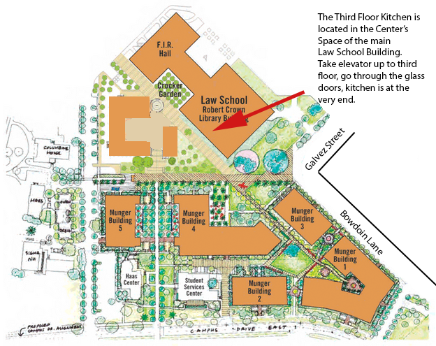 From Parking Structure 6 walk down Bowdoin Lane and you'll reach the Law School Building at the fork in the road.The Third Floor Kitchen is located on the third floor of the main Law School building.